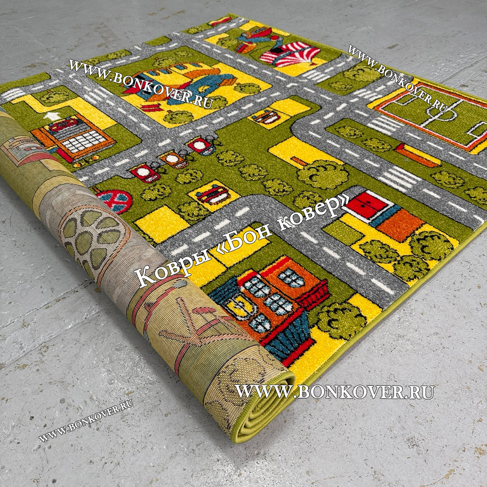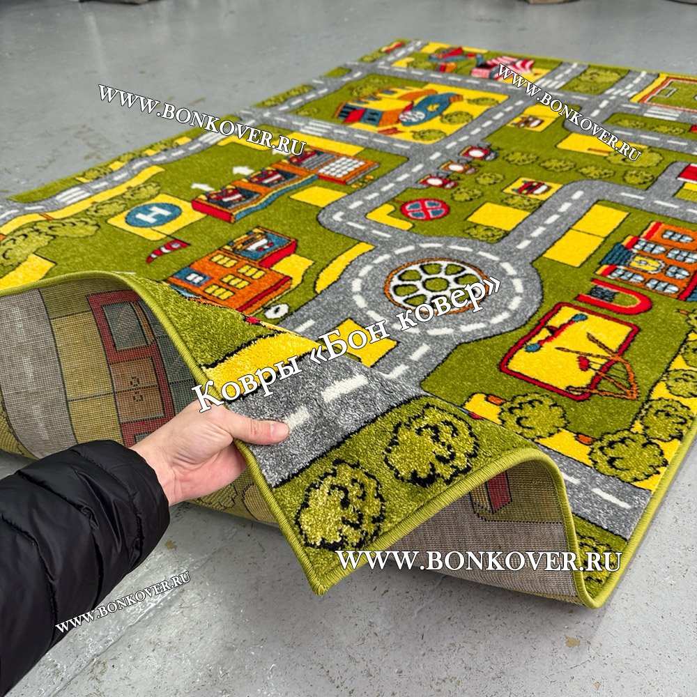 Детский Ковер Город 02 Зеленый не деформируется, сохраняет свою форму. Ворс легко восстанавливается, что не оставляет на поверхности изделия неприглядных отметин.